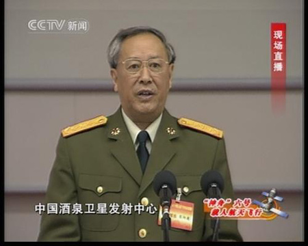陳炳德:在這舉世矚目、激動人心的重要時刻,請允許我首先介紹一下前來視察指導的黨和國家領導人,親臨北京航天飛行控制中心視察指導的有:中共中央總書記、國家主席、中央軍委主席胡錦濤同志,中共中央政治局常委、國家副主席曾慶紅同志,中共中央政治局常委、國家政協主席賈慶林同志,中共中央政治局常委、中央紀委書記吳官正同志。親臨酒泉衛星發射中心的有,中共中央政治局常委、國務院總理溫家寶同志,中共中央政治局常委李長春同志,中央政法委書記羅干同志,中央政治局委員、中央軍委副主席、國務委員曹剛川同志,還有全國人大、國務院、全國政協的領導。